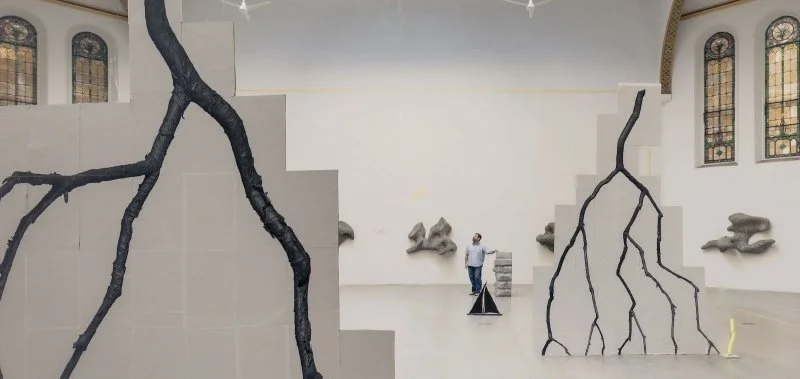 Below is the 18-month-old photo I was talking about that has the "model" for the current show. See all the photos & the article on Ocula.com here. Though the article doesn't mention it, they happen to show his “mock-ups” of the lightening sculptures, which look like enlarged xerox copies on cardboard so he can test the size?  You’ll also find a photo of an original small “twig” in that article link, that I'm assuming is one that was 3D scanned and enlarged.
